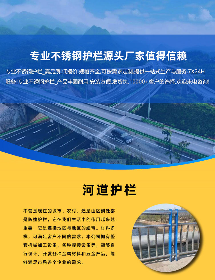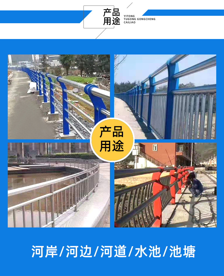 河道護欄不僅具有不銹鋼管的豪華美觀和現代氣息,又具有普通碳鋼管的堅韌性。是價昂不銹鋼管的替代品,它與鋼板立柱配合,做成城市、道橋等的安全欄桿。 不僅牢固、大方,且可造型各異,給都市別一種亮麗風景線。